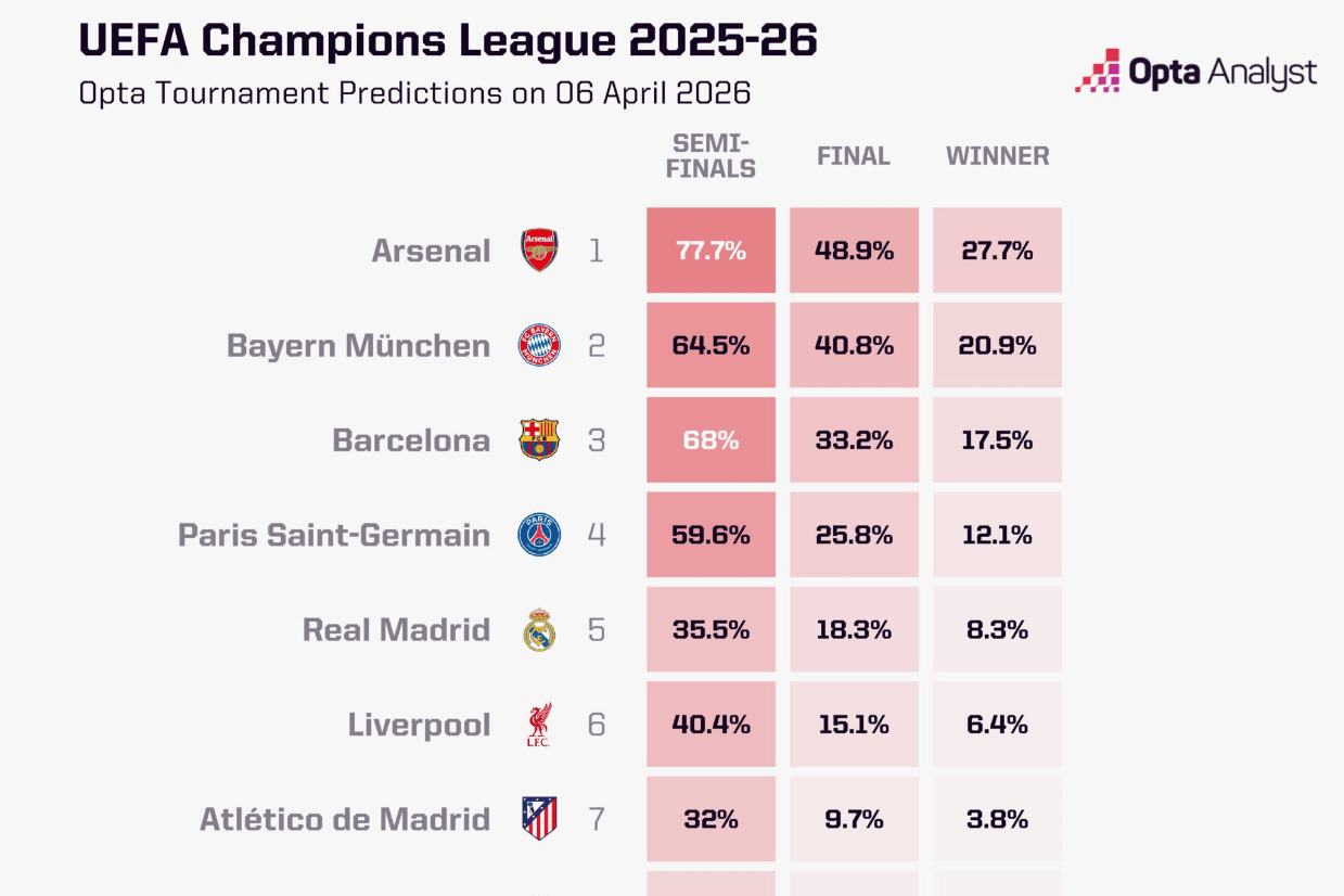 本周,欧冠四分之一决赛正式打响,首回合比赛将在周二、周三展开,次回合则安排在下周进行。Opta通过对每一场比赛赋予胜率,并在完整赛季路径中反复演算,试图还原最可能发生的竞争轨迹。